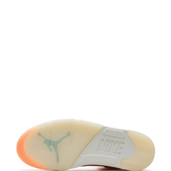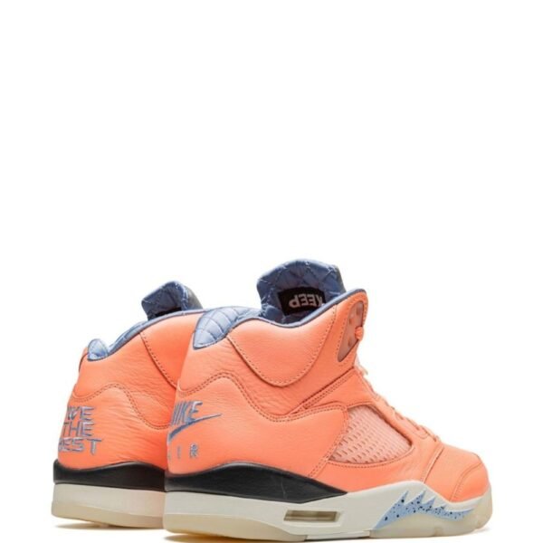 The DJ Khaled x Air Jordan 5 Retro is part of his “We the Best” collection. In this model, the upper appears in vibrant coral-hued leather contrasted with a silky quilted lining in Leche Blue, with the heel overlays adorned with a blue embroidered Nike Air logo on the right and ‘We the Best’ on the left. Underneath, an off-white polyurethane midsole with blue-speckled shark-tooth detailing and a translucent rubber outsole complete the look.